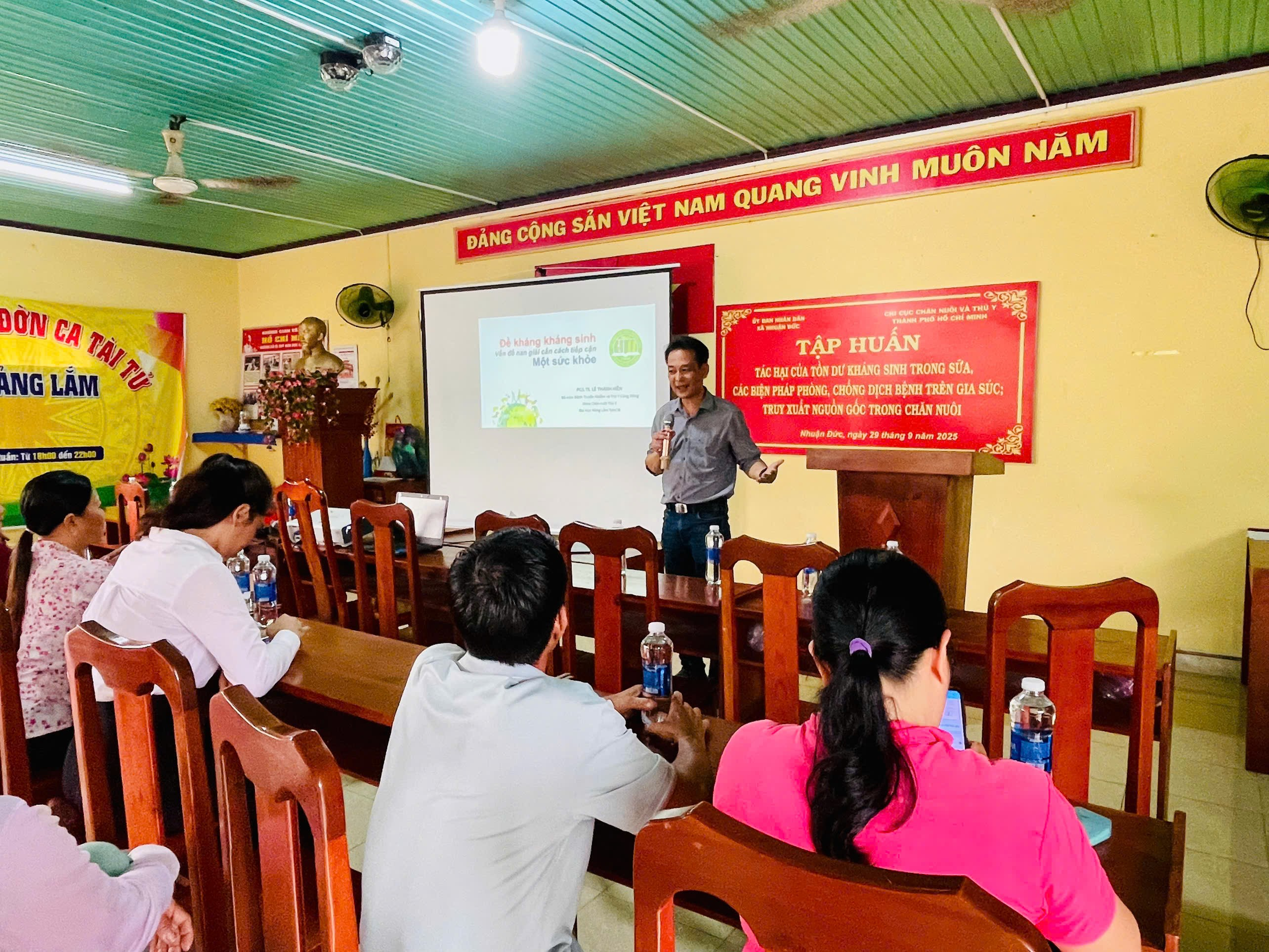 Đặc biệt, vào hai ngày 29/9/2025 và 30/9/2025, Chi cục đã tổ chức lớp tập huấn về kháng kháng sinh tại xã Nhuận Đức và xã Phú Hòa Đông. Báo cáo viên là TS. Lê Thanh Hiền - giảng viên Trường Đại học Nông Lâm Thành phố Hồ Chí Minh, đã trình bày chuyên sâu về những hiểm họa và các biện pháp thực tế để giảm thiểu tình trạng kháng kháng sinh.
