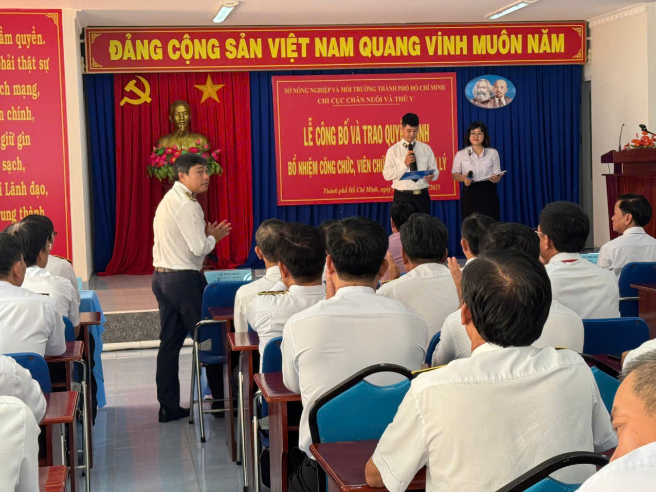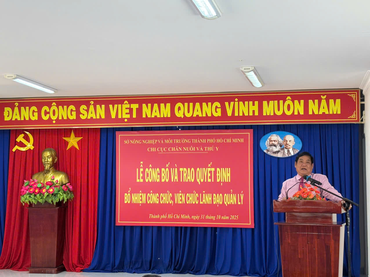Đồng chí Chi cục trưởng nhấn mạnh: "căn cứ Quyết định số 1176/QĐ-SNNMT-VP của Sở Nông nghiệp và Môi trường Thành phố Hồ Chí Minh quy định về chức năng, nhiệm vụ, quyền hạn và cơ cấu tổ chức lại Chi cục Chăn nuôi và Thú y Thành phố Hồ Chí Minh đã được tổ chức lại trên cơ sở hợp nhất của 03 đơn vị gồm Chi cục Chăn nuôi và Thú y Thành phố Hồ Chí Minh, Chi cục Chăn nuôi và Thủy sản tỉnh Bình Dương và Chi cục Chăn nuôi và Trồng trọt tỉnh Bà Rịa - Vũng Tàu. Hiện nay, các phòng chuyên môn, trạm trực thuộc đã đi vào hoạt động ổn định, riêng Trung tâm Chẩn đoán xét nghiệm và Điều trị bệnh động vật đang trình Sở xem xét loại hình đơn vị sự nghiệp công lập (loại 3). Để ổn định bộ máy tổ chức và nâng cao hiệu quả công tác quản lý nhà nước, đặc biệt là phòng chống dịch bệnh, Cấp ủy 03 cơ sở và Ban Lãnh đạo Chi cục đã thống nhất bổ nhiệm công chức, viên chức lãnh đạo, quản lý tại các đơn vị trực thuộc."