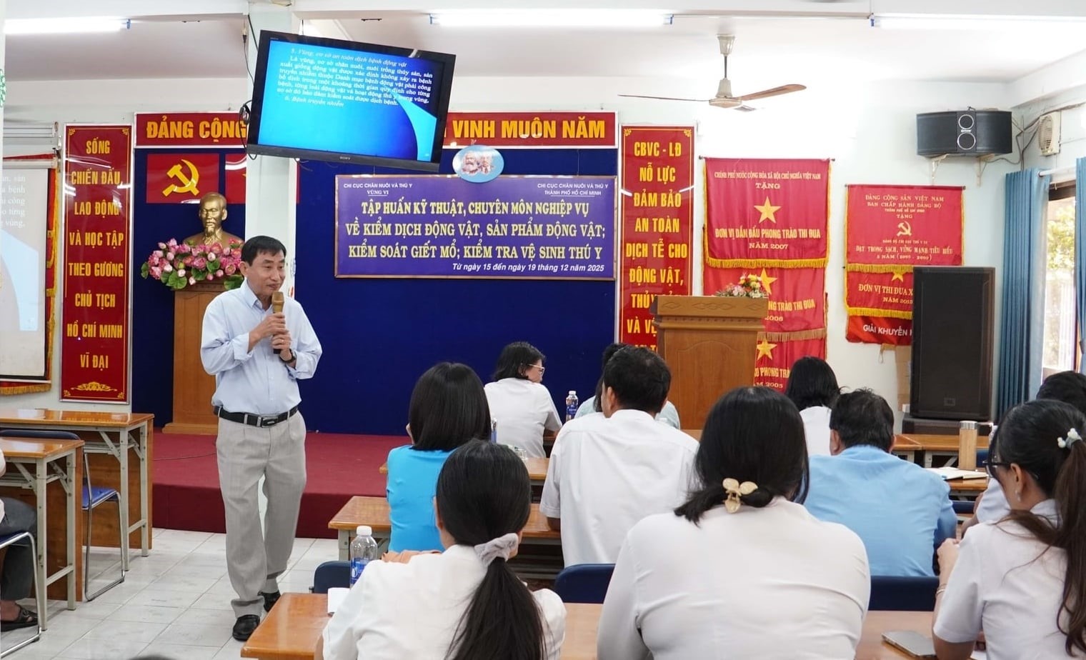 Sáng 15/12, Chi cục Chăn nuôi và Thú y vùng VI phối hợp cùng với Chi cục Chăn nuôi và Thú y TP.HCM tổ chức lớp Tập huấn kĩ thuật, chuyên môn nghiệp vụ về kiểm dịch động vật, sản phẩm động vật, kiểm soát giết mổ và kiểm tra vệ sinh thú y.
