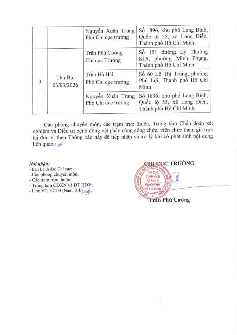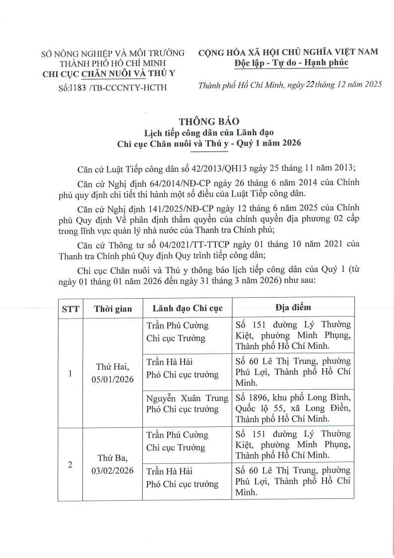 Chi cục Chăn nuôi và Thú y thông báo lịch tiếp công dân Quý 1 (từ ngày 01 tháng 1 năm 2026 đến ngày 31 tháng 3 năm 2026) như sau: