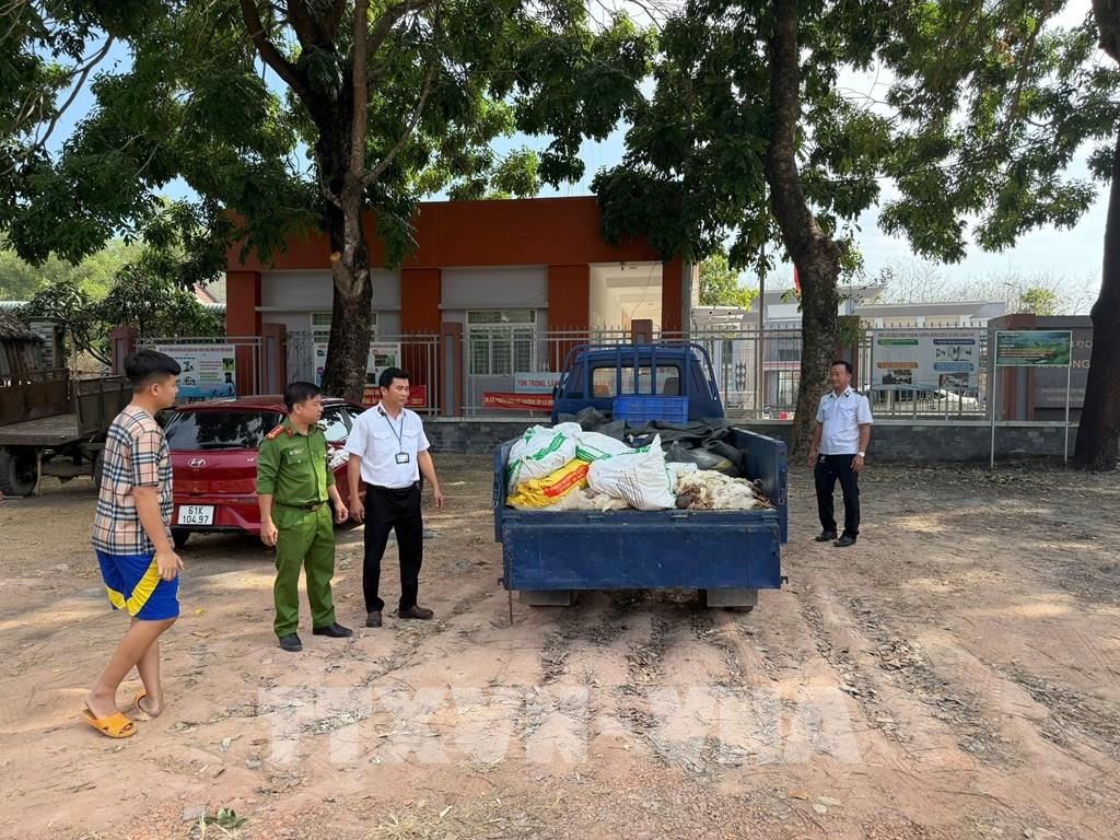Lực lượng chức năng phát hiện, xử lý vụ vận chuyển gà chết tại phường Long nguyên. Ảnh: TTXVN phát