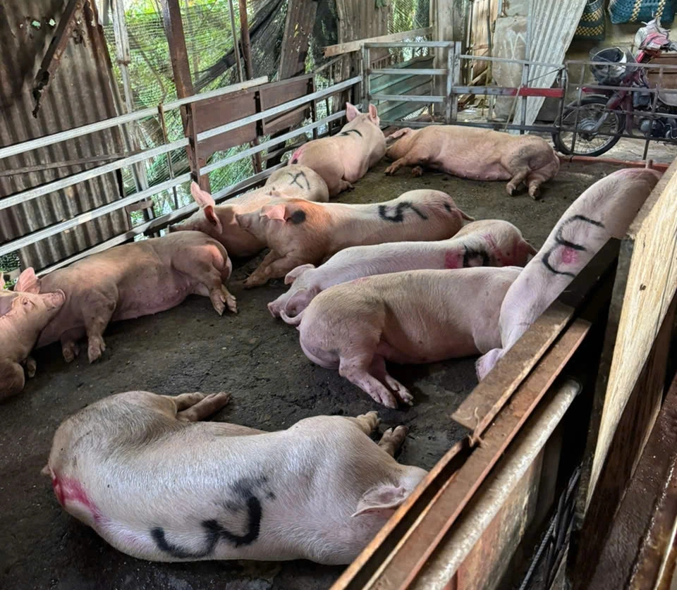 Nhiều con heo bị nhốt chen chúc trong không gian kín, một số được đánh dấu bằng sơn trên thân nhưng không có bất kỳ dấu hiệu nhận diện kiểm dịch nào. Điều này cho thấy nguồn gốc đàn heo chưa được xác minh rõ ràng, tiềm ẩn nguy cơ cao về dịch bệnh.