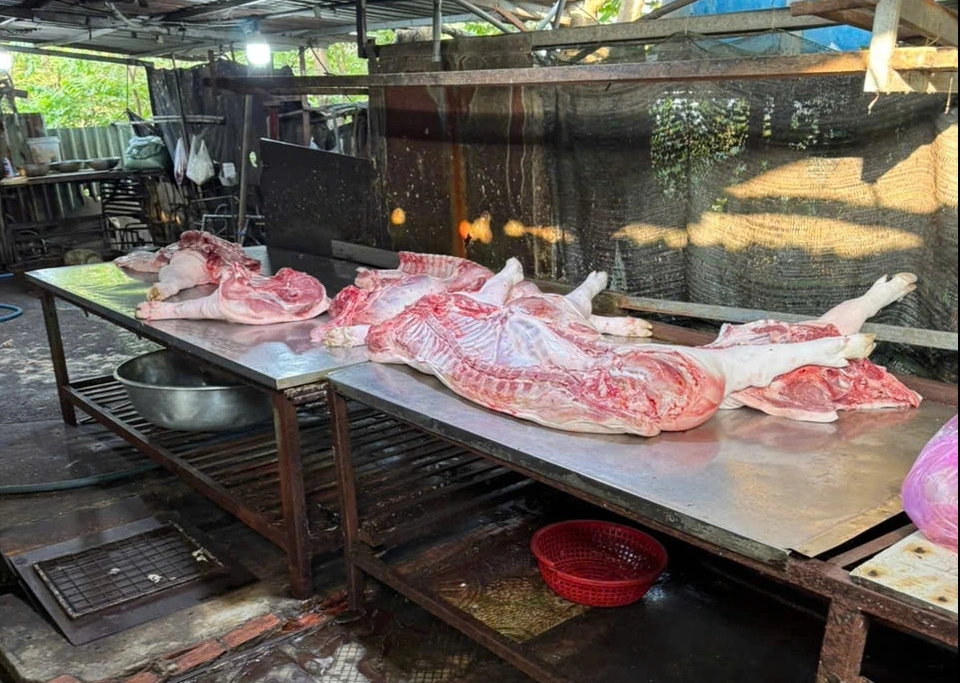 Đáng chú ý, khu vực sản xuất không được tách biệt với không gian sinh hoạt. Trong cùng một khuôn viên, xe máy và các vật dụng cá nhân được bố trí lộn xộn. Sự thiếu phân tách giữa khu sạch – bẩn, khu sản xuất – sinh hoạt cho thấy hoạt động mang tính tự phát, không tuân thủ bất kỳ quy chuẩn an toàn nào. Lò giết mổ heo “chui” với hàng loạt sai phạm Làm việc với cơ quan chức năng, các chủ cơ sở khai nhận toàn bộ số heo được thu mua từ tỉnh Tây Ninh. Tuy nhiên, tại thời điểm kiểm tra, các chủ lò không xuất trình được giấy tờ chứng minh nguồn gốc xuất xứ cũng như giấy chứng nhận kiểm dịch động vật theo quy định. Ngoài ra, cả 2 cơ sở đều không có giấy đăng ký kinh doanh, hoạt động giết mổ diễn ra tại địa điểm chưa được cơ quan có thẩm quyền cấp phép, không đảm bảo điều kiện vệ sinh thú y.